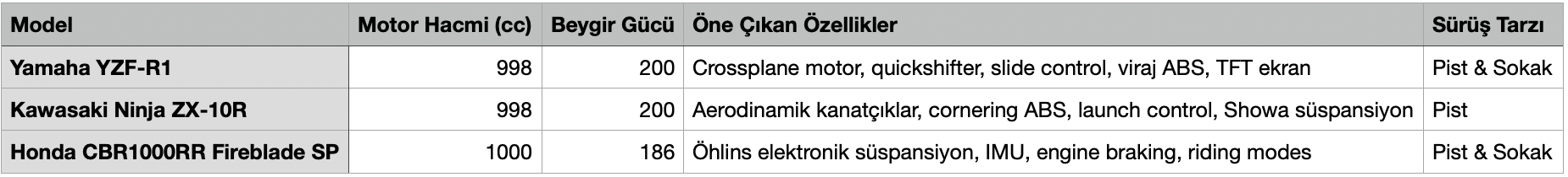 En iyi racing motorlar hangileri? sorusunun tek bir cevabı yok; çünkü her sürücünün beklentisi, tecrübesi ve kullanım alanı farklıdır. Kimileri pistte tur rekorları kırmak ister, kimileri ise şehirde agresif ama kontrollü bir sürüşü tercih eder. Bu nedenle racing motosiklet seçimi yapılırken motorun teknik özelliklerinden çok, sizin sürüş amacınıza ne kadar uyduğuna odaklanılmalıdır.